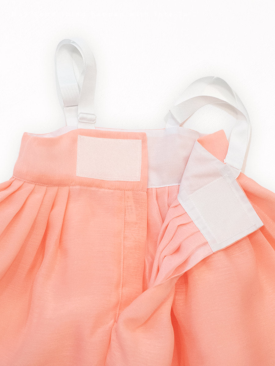 The sleeves are multicolored to add another layer of fun and enjoyment to the baby girl hanbok in coral.