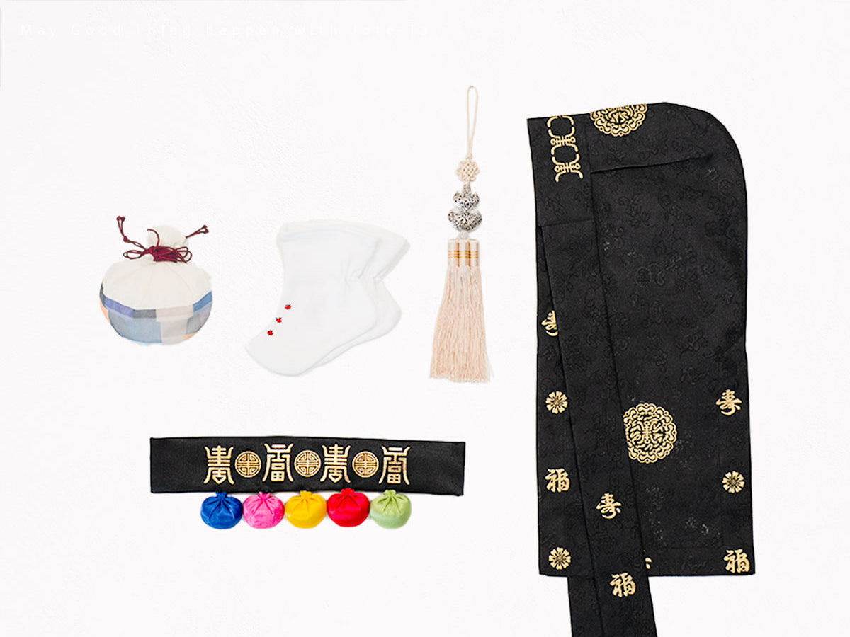 - Complete Set which includes a Dol belt (band-type), hat, norigae, fortune pouch, and socks