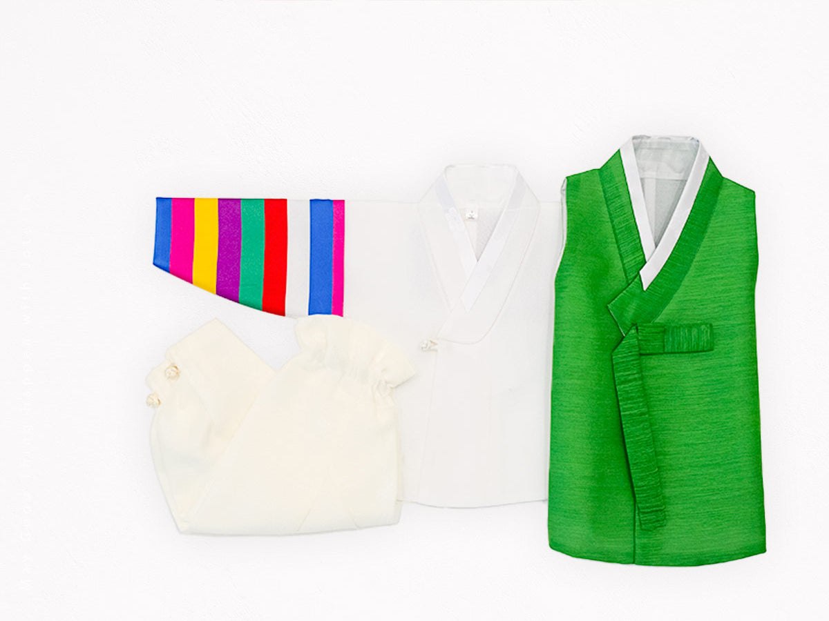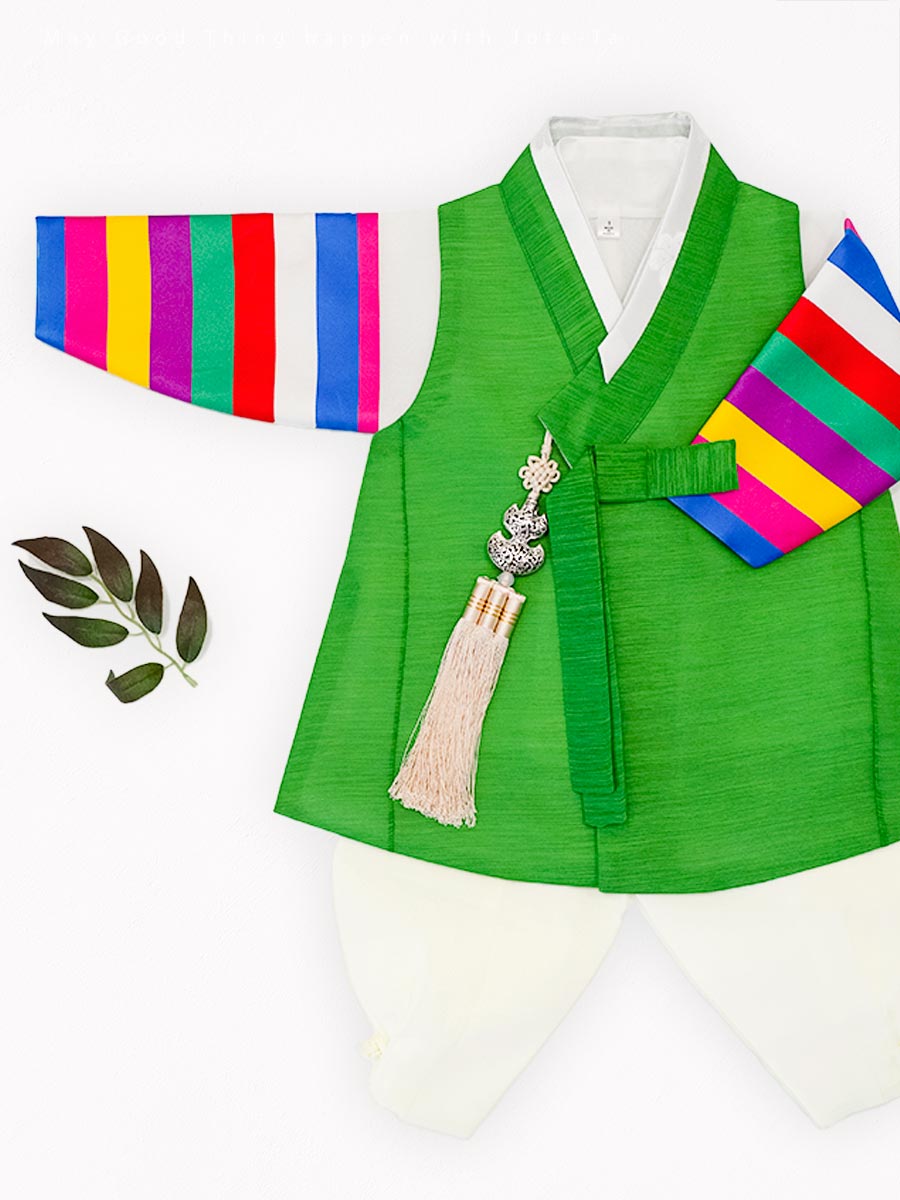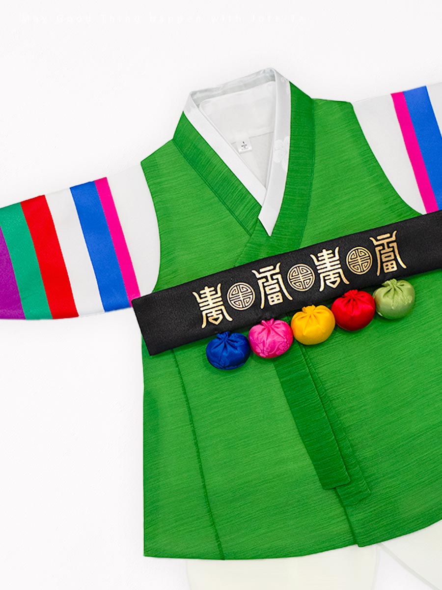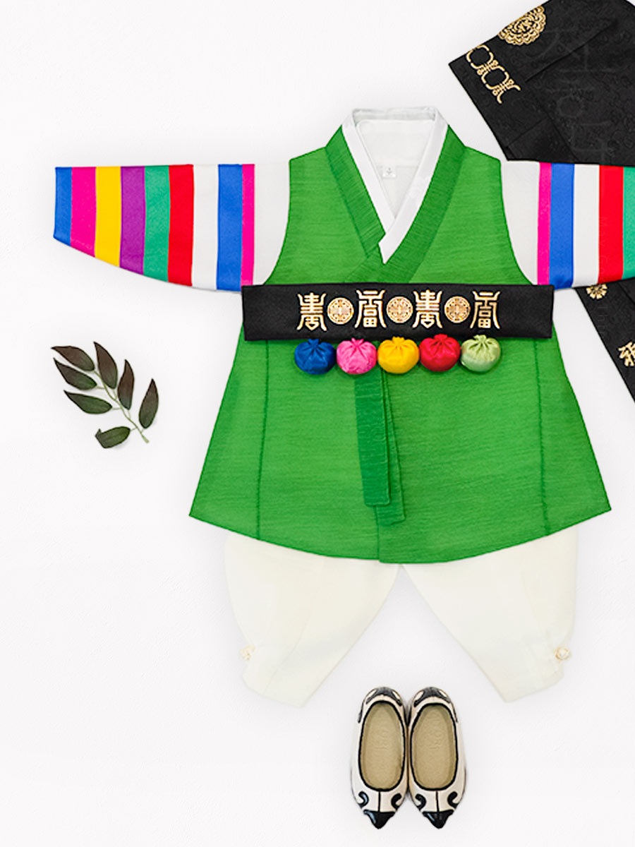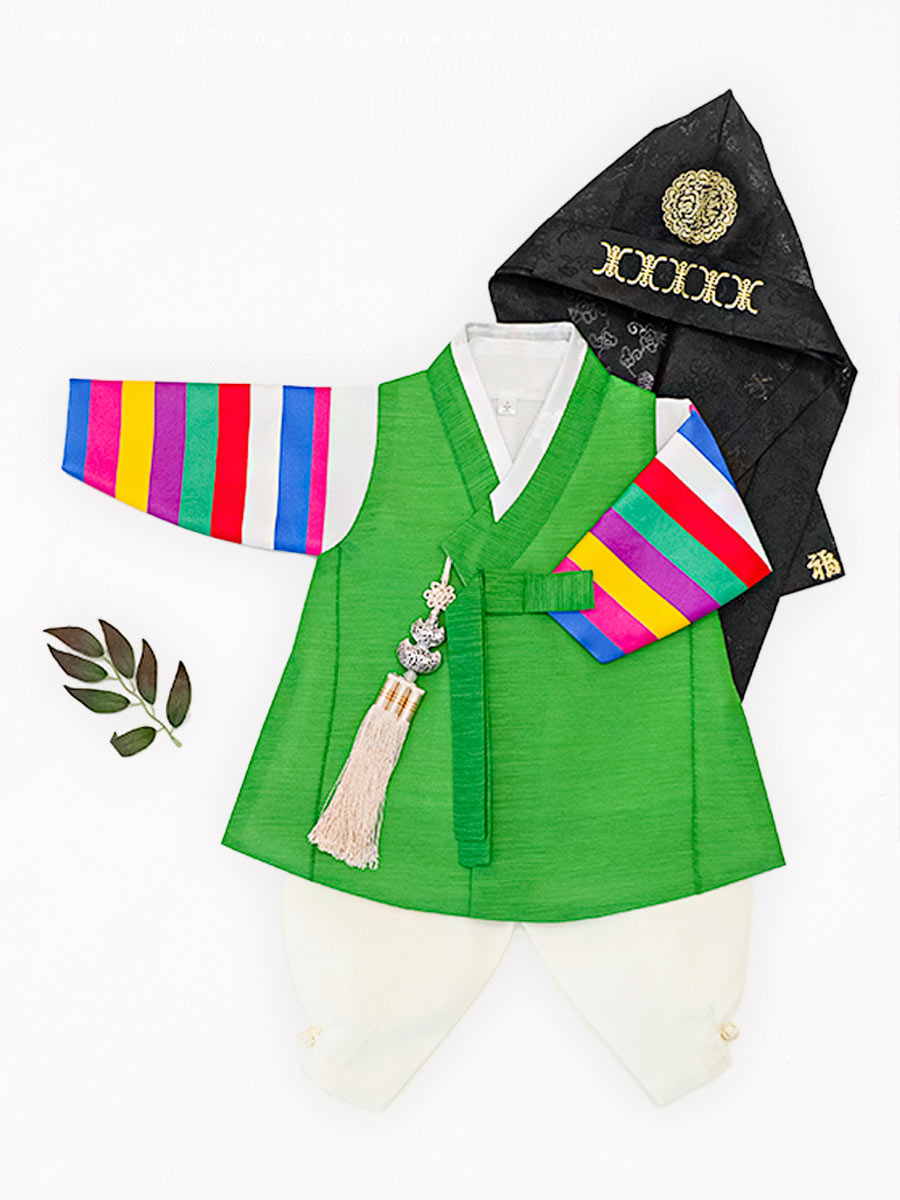 Celebrate a special Korean occasion with a Playful Saekdong Baby Boy Hanbok in Green